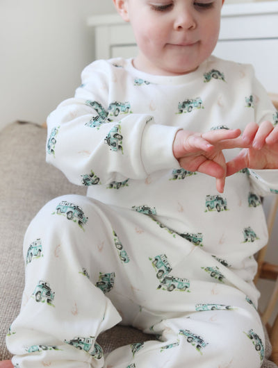 Thick organic cotton that’s brushed for extra softness - our sleepsuits and pyjamas are the ultimate in luxury sleepwear. Adorned with our signature country themed watercolour prints.